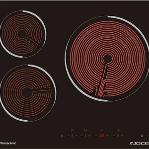 Placa vitrocerámica JOCEL JP3EV002181 con 3 zonas, cristal sin marco, 6200 W de potencia y control táctil. Fácil de usar, rápida y programable hasta 99 minutos. Ideal para cualquier cocina moderna